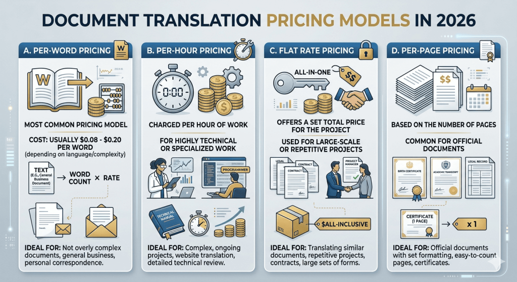 Understanding the different pricing models used by translation agencies can help you choose the best service for your needs. Let’s look at some common pricing models in document translation: